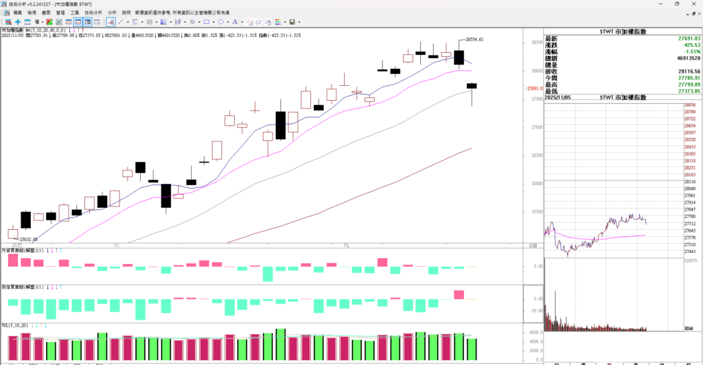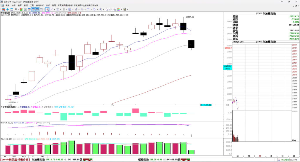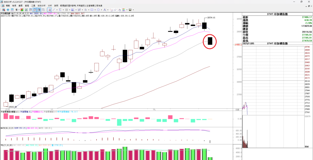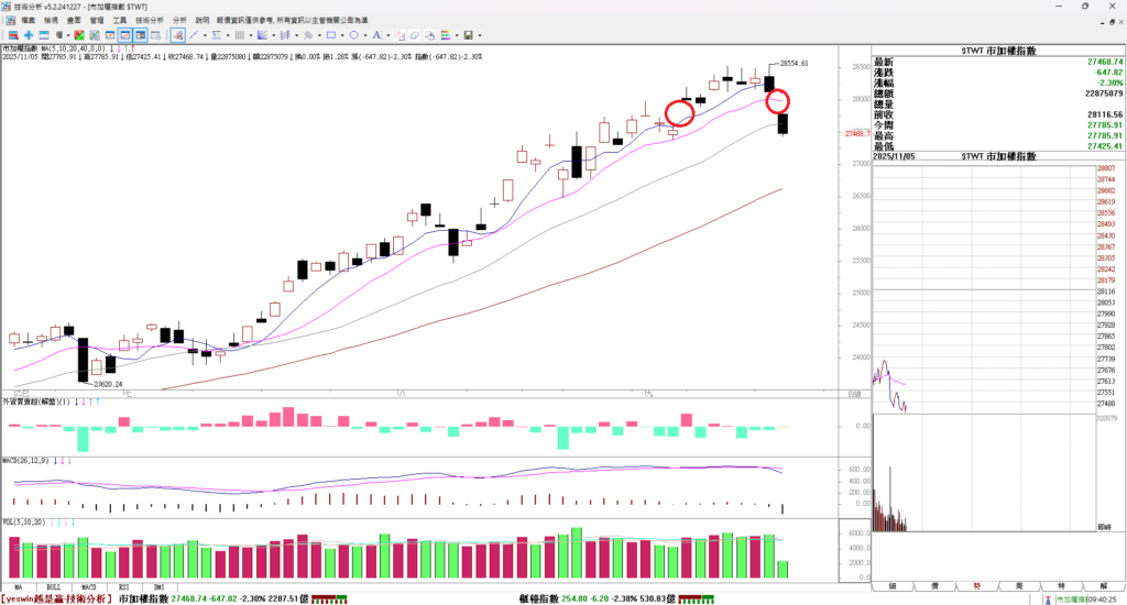 大家早安,台股昨天衝高後下跌 來個A轉,最後下跌224點收28117,與最高點28594計算 下跌了480點左右,很大的跌幅。而且夜盤繼續下跌。昨天在權值股帶頭下台股下跌,台積電跌5元、光寶科蝶8元、鴻海跌2.98%、廣達跌3.36%、緯創跌3.14%、技嘉跌3.6%、國泰金和富邦金都上漲。電子下跌金融撐盤。台股跌破五日均 尚在10日均之上,距離20日均 27605 只有500點,距離不遠。所以台股回測20日均並不難。當台股回測20日均線表示過去一個月做多的都白費,走回原點。這是目前的狀況。其實這也在預期之中,之前有一部週報說 : 股市最大風險是漲太多,裡面有提到漲一段以後再長紅K,可能是強弩之末,股市必須回檔休息。十一月剛開始 目前月K收黑。