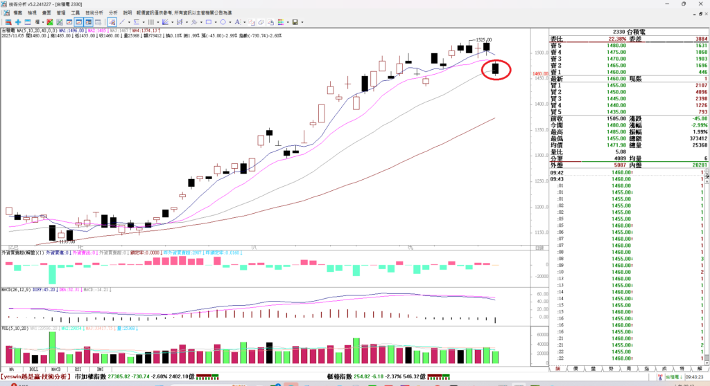 台積電日K 長黑摜破20日均線,一樣偏弱,這裡的偏弱是指今天 不是指趨勢轉空喔,走勢是從短到長。短線下跌不代表長線走空