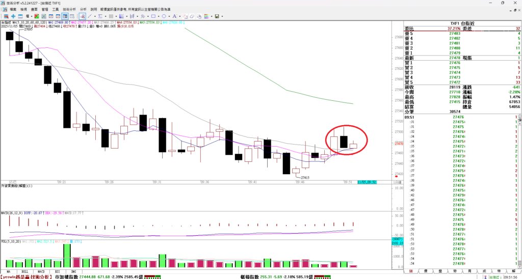 台指期一分K 震盪往下,目前下跌有點拖泥帶水,抗跌