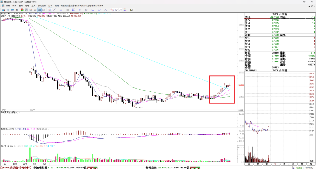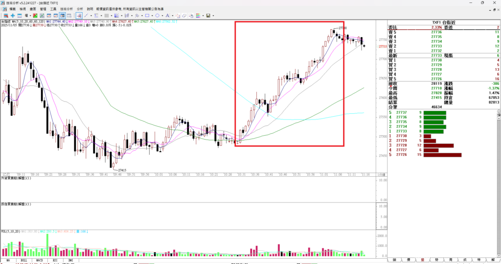台指期一分K 紅K反彈過均線 ,均線是目前觀察重點,站上均線短線強,跌破均線弱