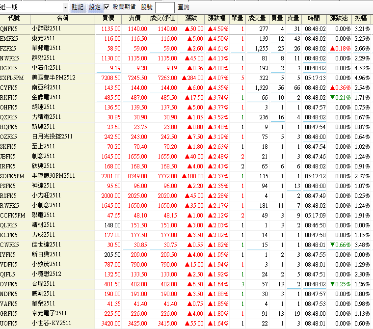 股票期貨漲幅排行、群聯、東元、華邦電、中石化、南亞科、金像電、力機電、日月光、至上、創意、欣興等股票