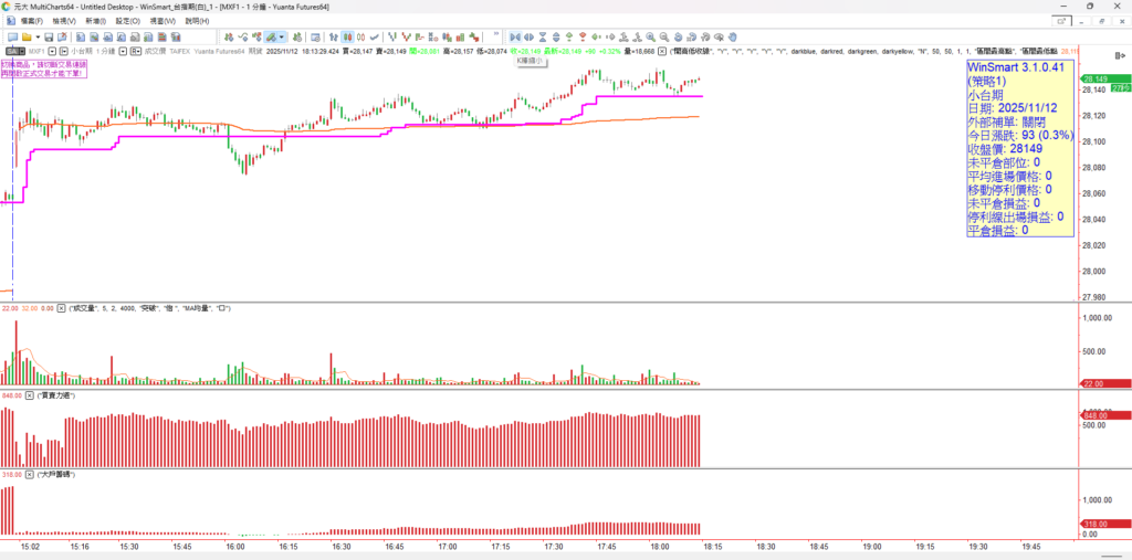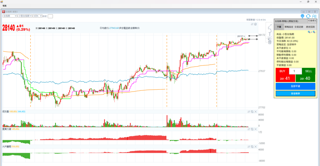 看台指期五分K + 多空電話線,紫色電話線往上代表行情上漲,所以從前天晚上到昨天晚上七點 寫文為止,都是偏多走勢
