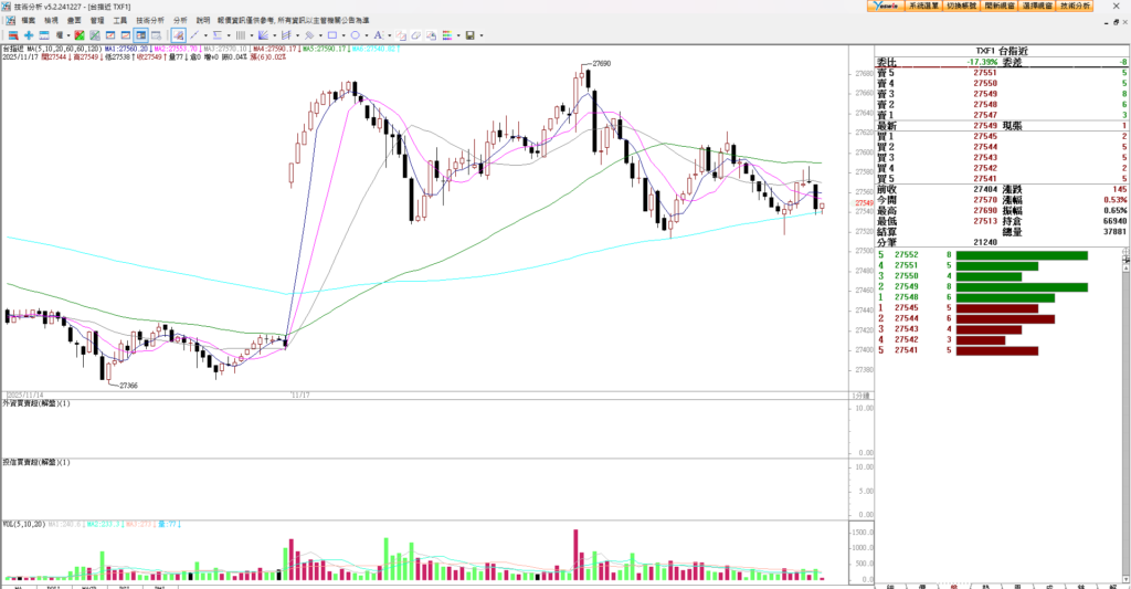 看台指期五分K,週五晚上本來大跌三百六十多點,但是美股開盤後就反轉,一路往上拉,讓台指期夜盤呈現一個很大的T字棒,高低差有四五百點的價差。本來危險的走勢經過禮拜五晚上的V轉走勢,變成有個隱形的支撐在那。