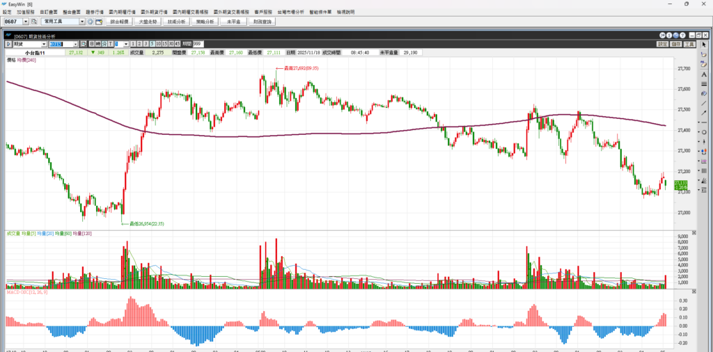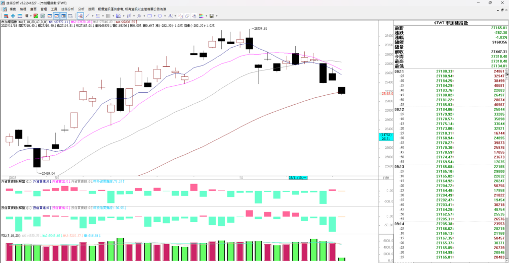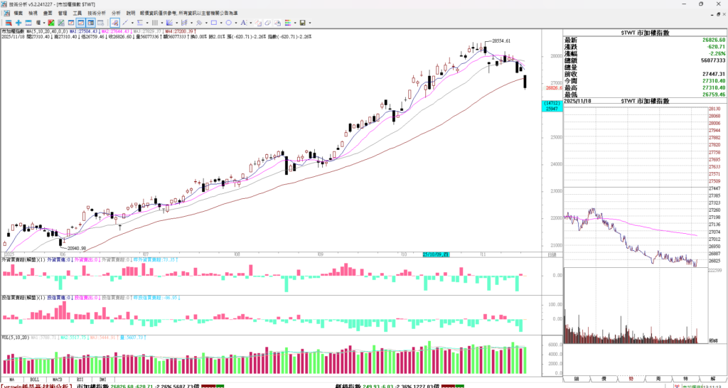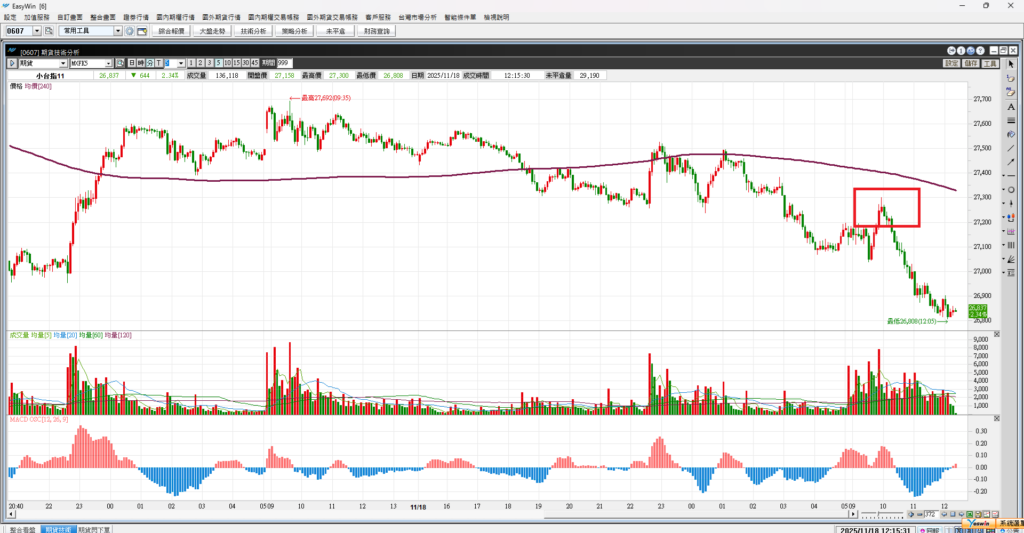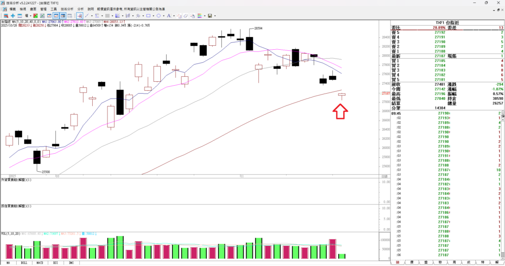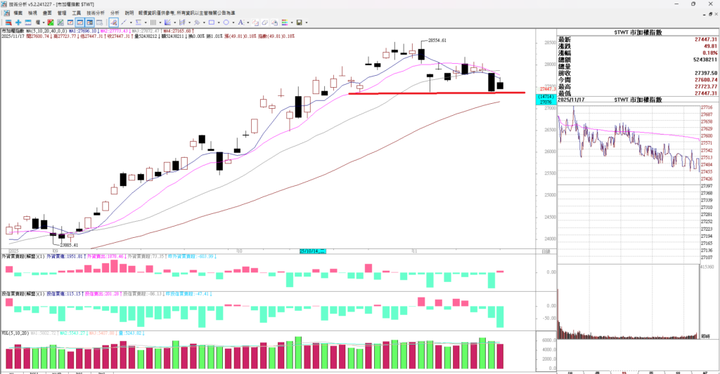大家早安,昨天台股開高走低收黑K,原本上漲兩百多點最後上漲49點,價格收在27447。雖然股價小漲 但是因為收黑 所以k棒並不好看。果然昨天夜盤就先漲後跌,指數下跌306點。現在大盤在山海關處,只要跌破 就形成一個小頭部。所以這裡還是要小心,不要過度追價,昨天台股一度大漲兩三百點,記憶體、PCB開盤暴漲 ,但是最終多檔股票收黑。代表賣壓仍重,請投資者小心。