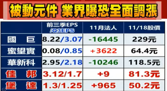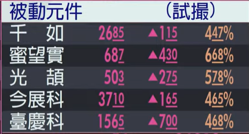 今天被動元件繼續上漲 例如金山電、蜜望實、佳邦、寶達