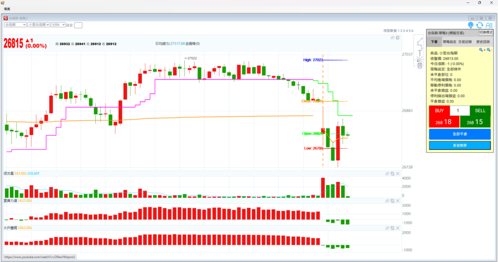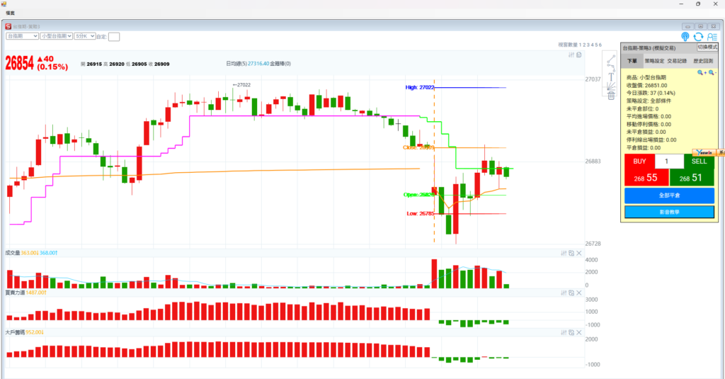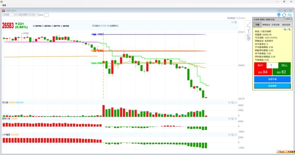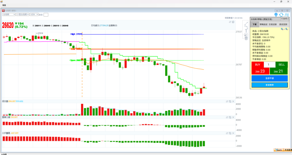 看台指期五分K,走勢最近兩天震盪走低,是空頭走勢。昨天白天雖大跌670多點,但是夜盤開低走高,有稍許止跌味道。等隔天早上八點四十五分開盤 再做確認。