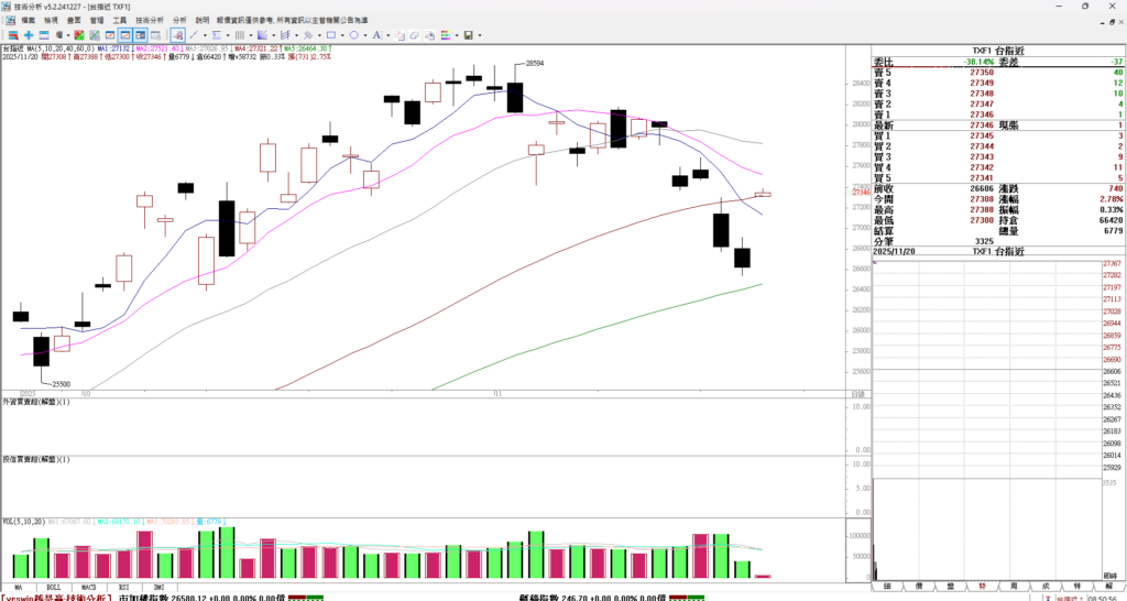 大家早安,台股昨天下跌 176點,破40日均線後繼續下跌,尚無止跌的模樣。指數往60日均線位置前進,60日均線在 26373 ,昨收26580。台股從高點 28854 跌到昨天為止 已經下跌 2274點,跌幅也算大了。兩千多點的跌幅,這段期間雖然股市修正,可是盤面總是有股票上漲,例如昨天被動元件族群比較強。但是要留意,當大盤走弱,大多數個股也不會好,操作勝算偏低,所以順著大盤操作是比較好的操作模式。
