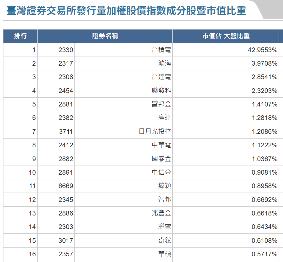 前十六名權值股如下