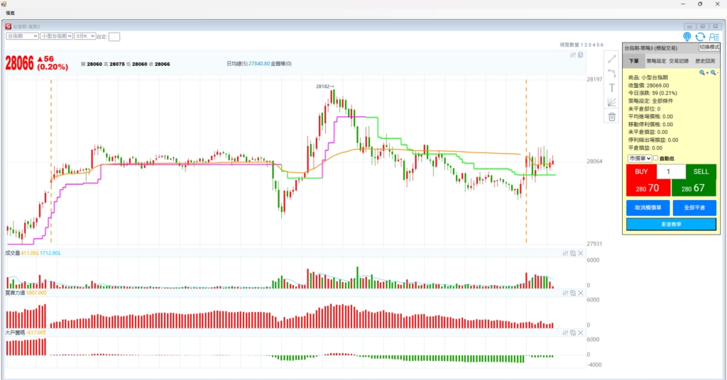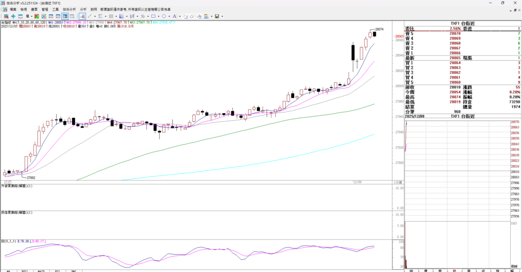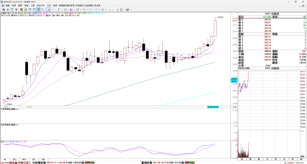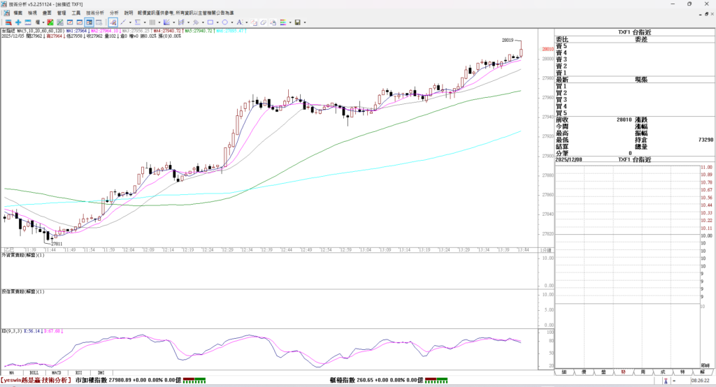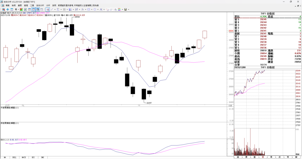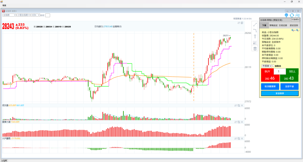 台指期五分K,指數一路往上,籌碼買賣力道始終是多方 表示今天有買盤。上漲 233點 28243