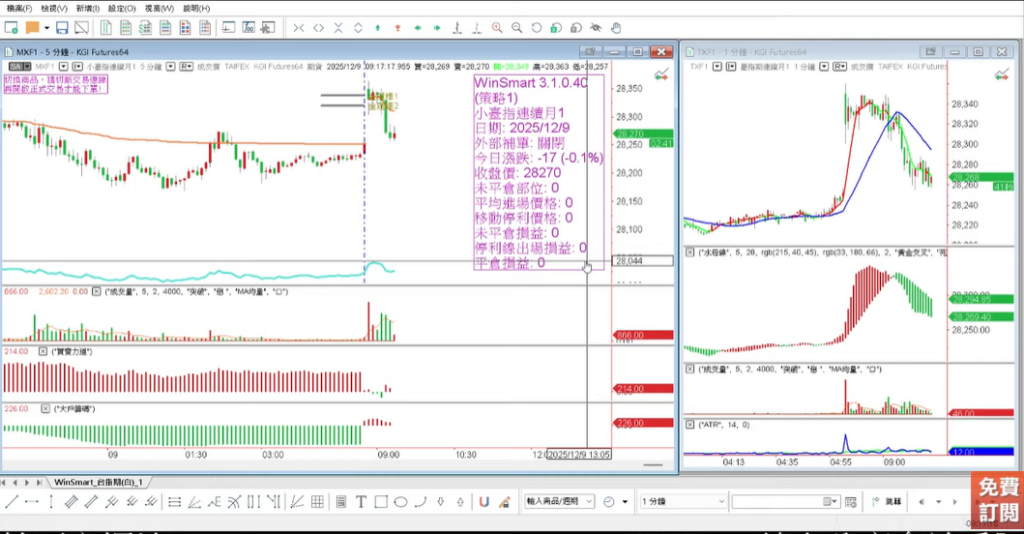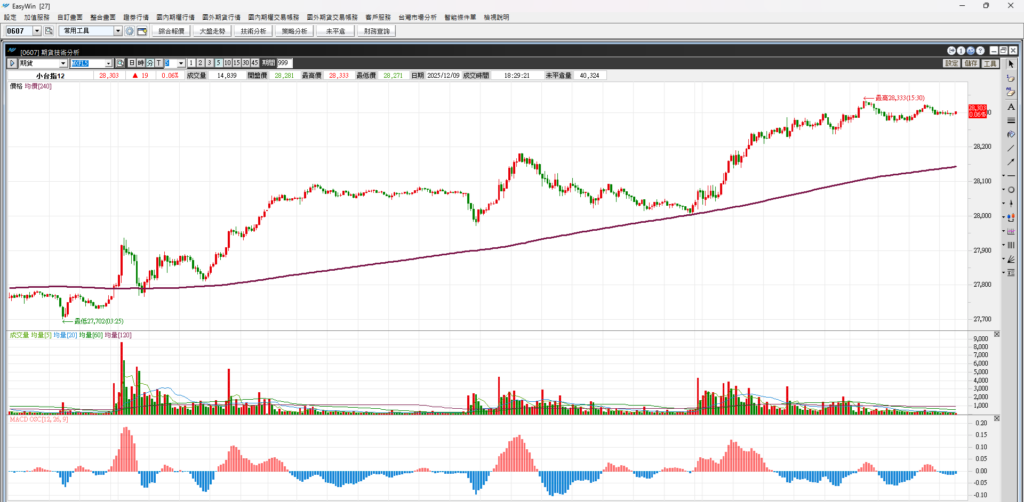 台指期五分K走勢,指數在長天期均線 240 MA之上 震盪向上走。走勢偏多,價格拉回均線都是買點。