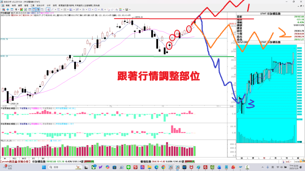 大家早安,台股昨天小跌 121點,開高走低,台股將近前高的位置 收黑K,黑K表示有可能回檔,看他回檔到哪邊。目前市場是台幣熱錢進入台股走勢上漲,外資買超,政府作多,有利上漲。行情比想像中的強。我覺得最好的方式不是預測正確,而是贏在修正。用試探性交易法,看錯停損,看對抱住,並且加碼買更多,這是最好的做法。