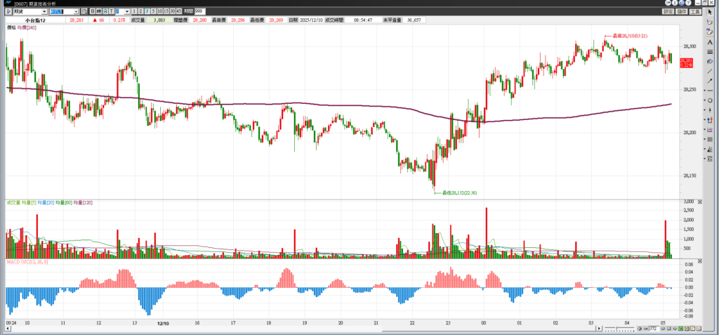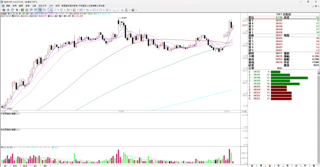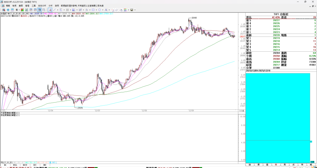 台指期衝高 + 拉回, 上漲 62點,底下籌碼 一紅一黑,盤整盤