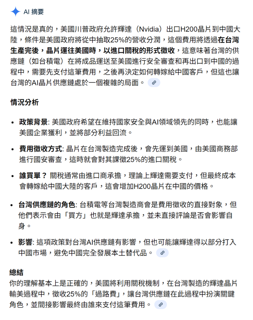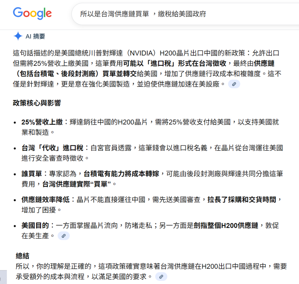 美國抽 25%,中國不想付,美國不會付,NVIDIA不想全部付 → 最後就變成台灣供應鏈要分攤吸收。