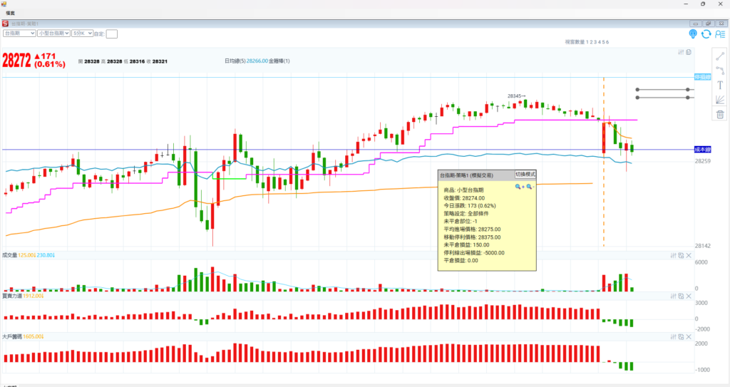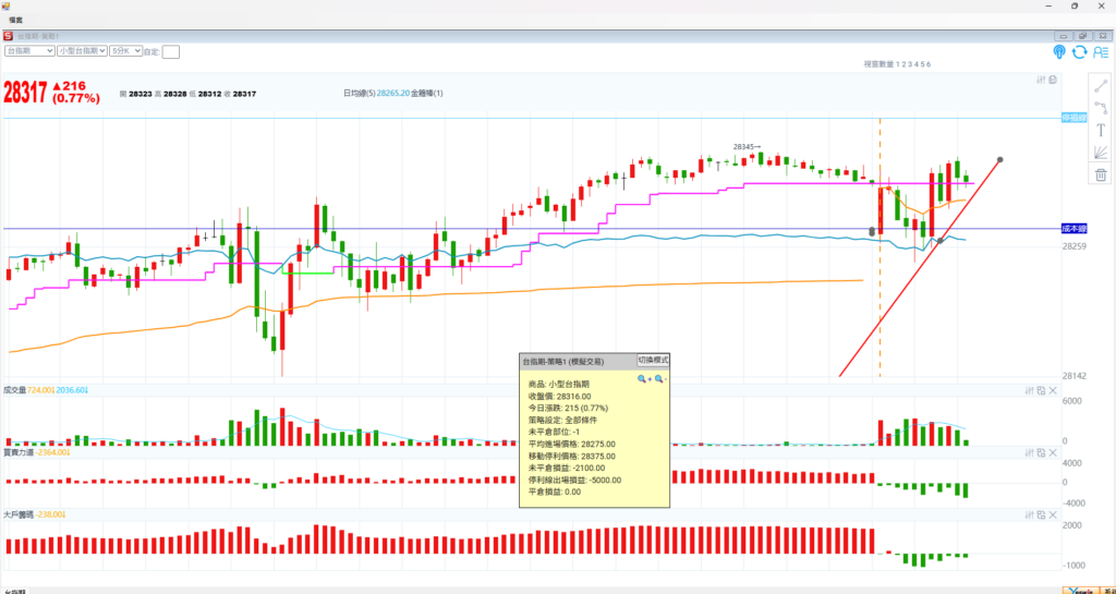 台指期五分K,指數上漲 216點, 但是籌碼是空方,就再看一下 是籌碼翻多或是指數下跌