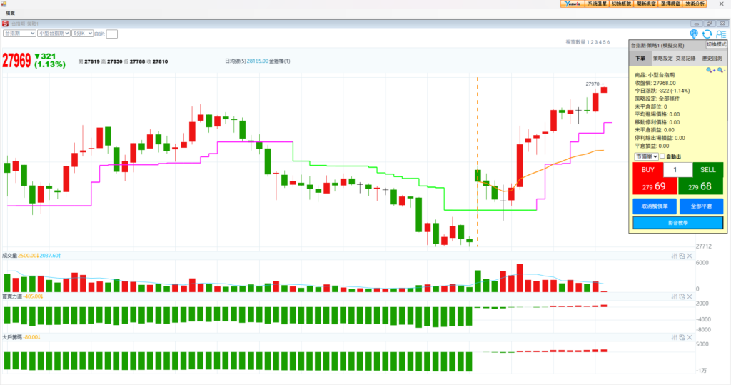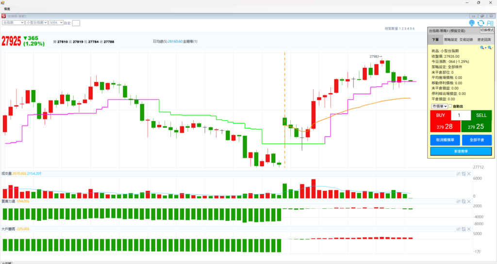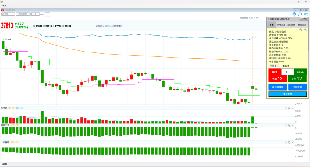 台指期五分K走勢,指數下跌 571點,從下午六點多開始就開始走跌,綠色電話線往下,走勢頭頭低,下方籌碼空方數據,這些都是下跌的特徵,這裡可有很長時間可以讓投資人多單出場、空單進場。