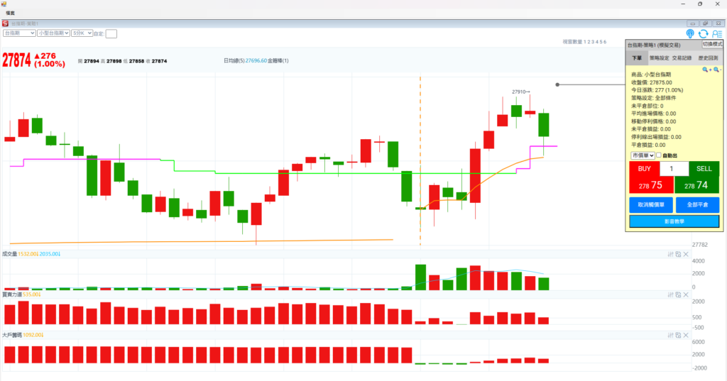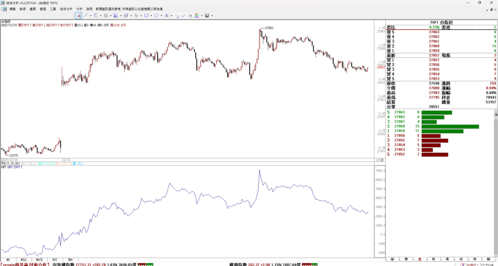看期貨五分K走勢,你可看到走勢上沖下洗 + 盤整震盪,這是最近走勢的寫照。建議要預先設好停損停利點,以免行情反向走一大段 產生巨大損益。