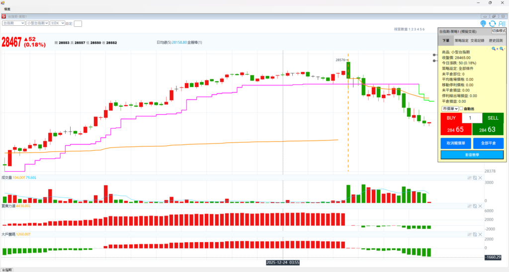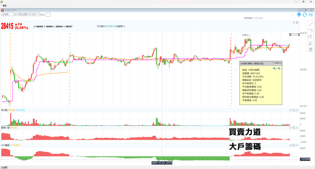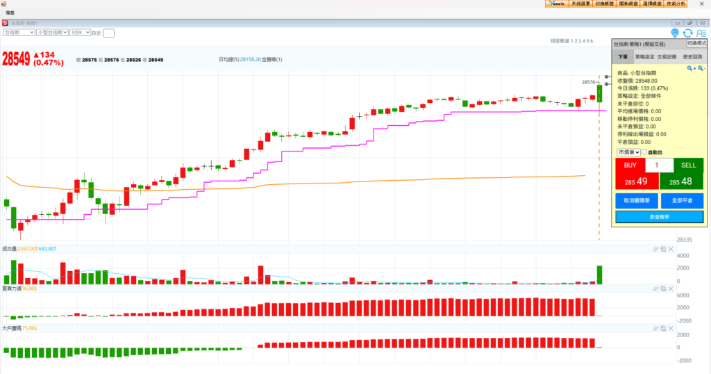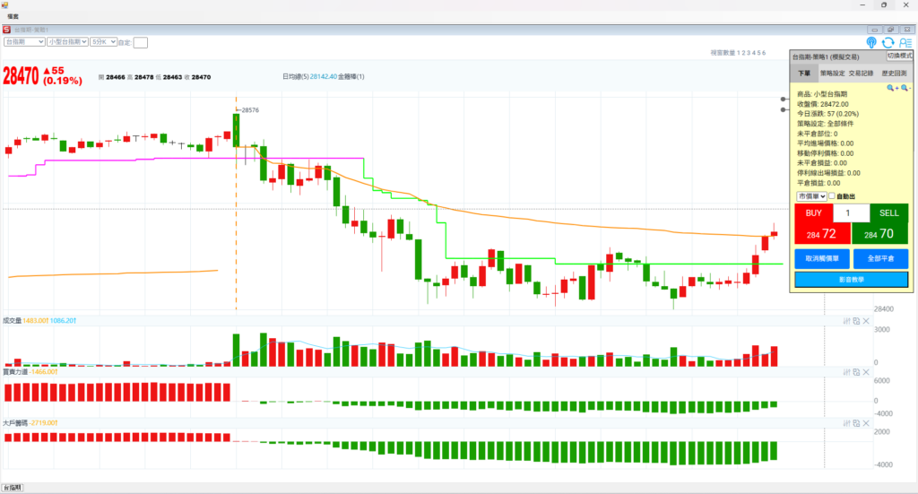 看台指期五分K + 多空電話線。紫色往上 走勢往上,綠色往下 走勢往下。另外看籌碼 買賣力道和大戶籌碼, 是多方 就會有紅色柱狀體,是空方就會有綠色柱狀體,如下圖。只要籌碼多方 + 電話線紫色往上,行情就容易上漲。只要籌碼空方 + 電話線綠色往下 行情就容易下跌。