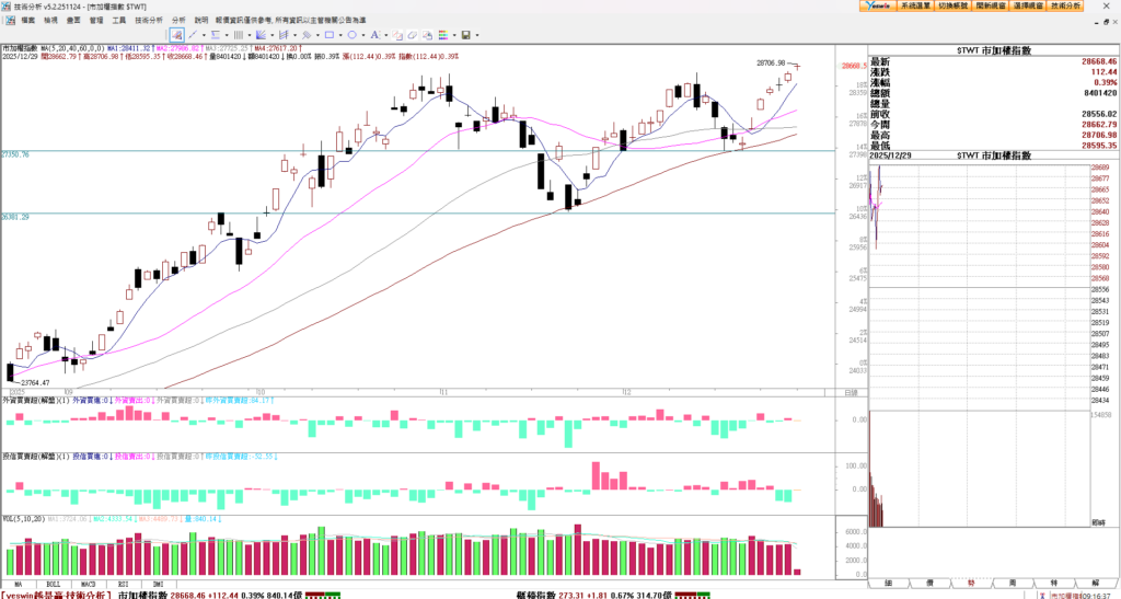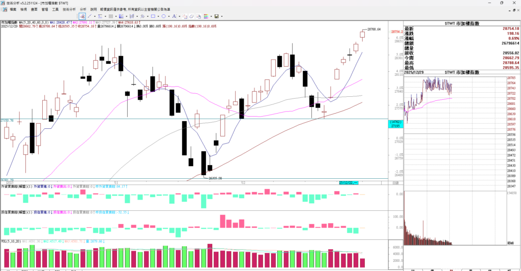 指數繼續大漲 +198 今天創新高 收紅K 28754