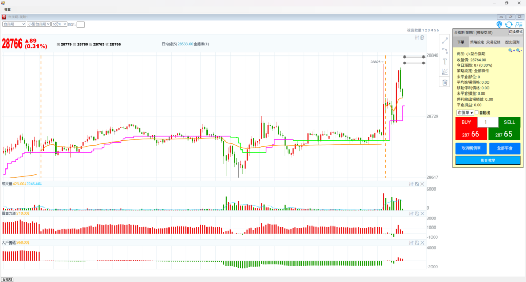 紫色電話線往上 代表行情正在往上走,綠色電話線往下 通常K棒再往下跌。 台指期目前是震盪上漲格局。