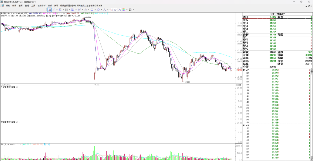 台指期開低 295點,開低的幅度有縮小,原本跌 435 點 ,籌碼 買賣力道和大戶籌碼 都是多方數據,表示有買盤
