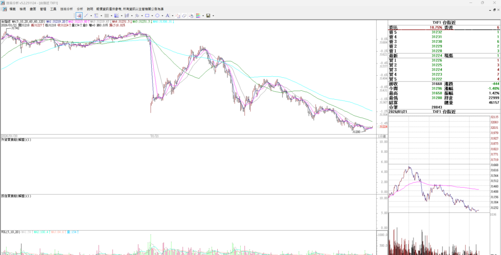 看台指期五分K 昨天白天走勢開抵走高,到了夜盤是開低震盪走低 收最低。五日均是支撐轉為壓力。