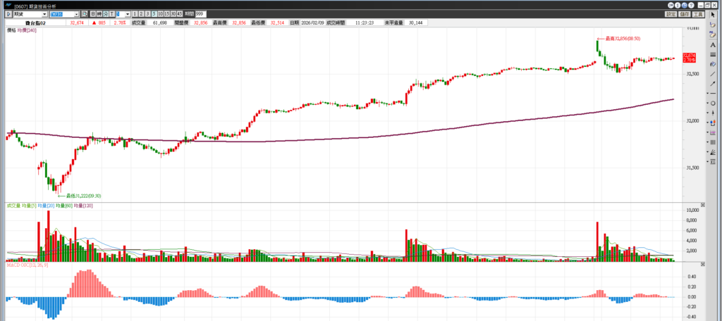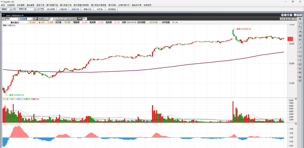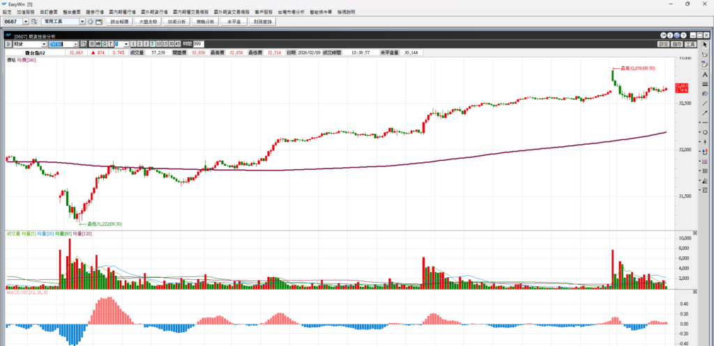 台指期五分K,上週五破低後的止跌上漲,是最好買點,一口氣拉了快一千五百點的漲幅。周一台股要精采了