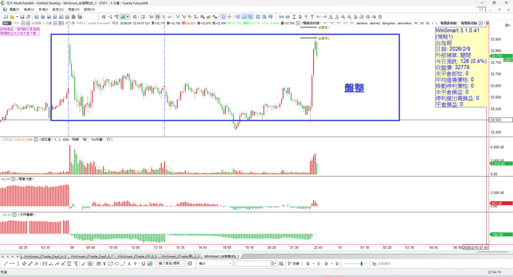 昨天台指期大漲 862點,指數高檔震盪盤整, 夜盤漲到32814 ,走勢強勁 ,昨日震盪趨堅 (藍色框框處) 有四百點的幅度,意思是台指稍微一震盪就是四百點的振幅。很大。