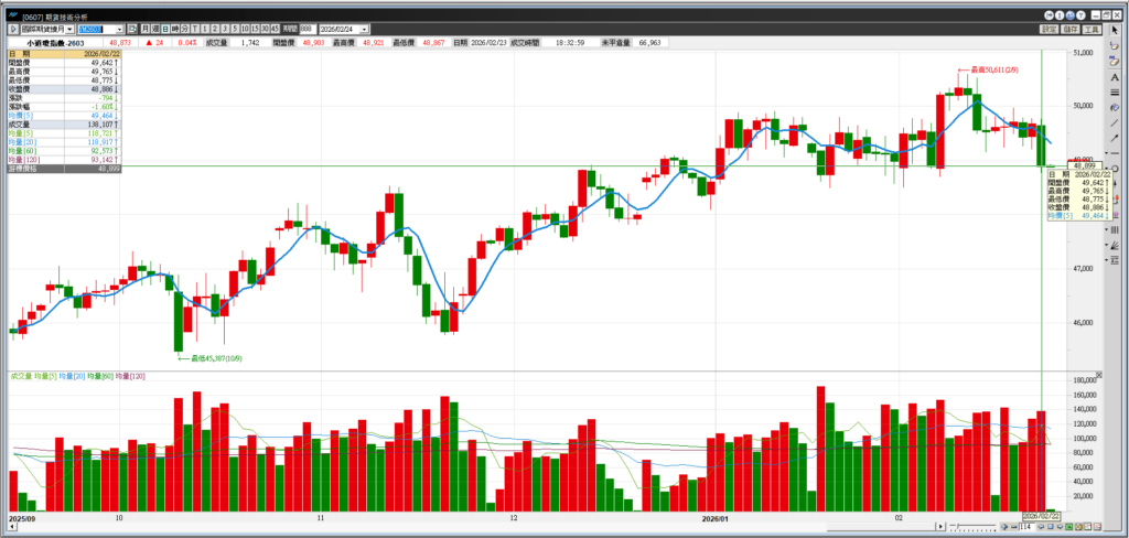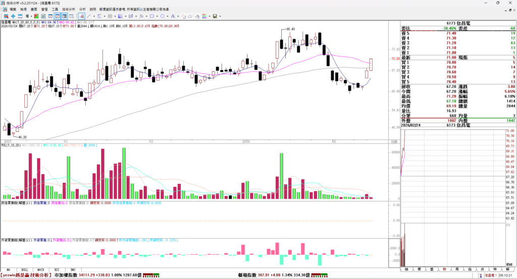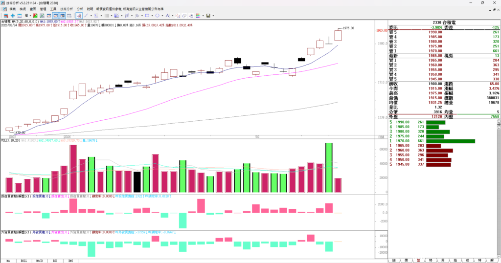 大家早安,昨天是馬年第一個交易日,昨日台指期開高走低,最高上漲五百點 最後只上漲154點,指數開高走低顯示有賣壓。賣壓來自於權值股。聯發科下跌60元 跌3.2%,日月光開高走低收黑 高低差7%、廣達開高走低 高低差2%、奇鋐開高走低 高低差8% 、 台積電也是收墓碑 小跌 15元。這些權值股的下跌 導致台股開高走低。這表示資金從權值股流出 。另外一方面 中小型股上漲。漲停股票高達83家,跌停股票只有2家。上漲家數1430家,下跌家數只有414家,表示開紅盤當天雖然權值股收黑,但是資金轉進中小型股票,盤面極其熱鬧。這種情況下 對後續走勢不用太悲觀,要觀察兩個,一、權值股是否持續下跌。二、中小型股是繼續上漲或是跟著大盤走跌而下跌,這是要關注的地方。