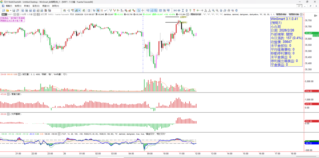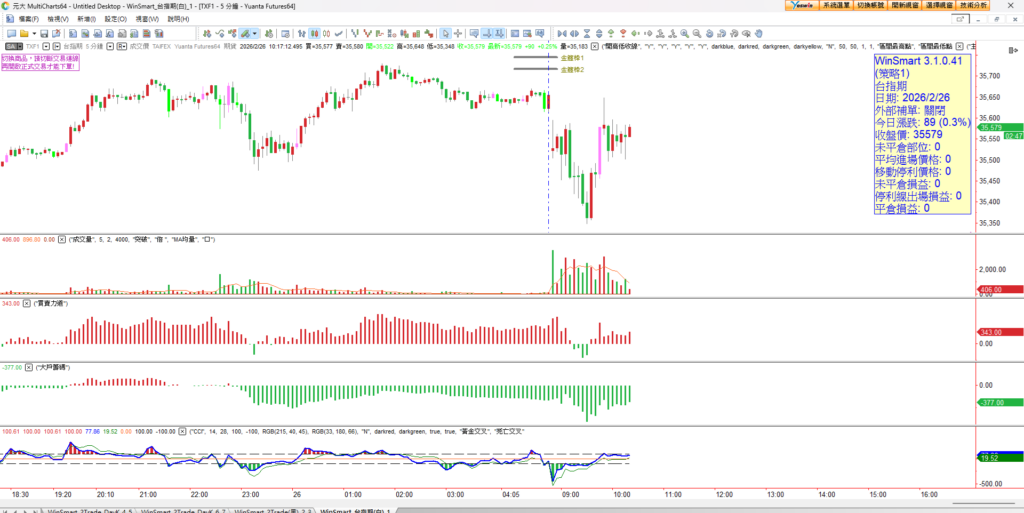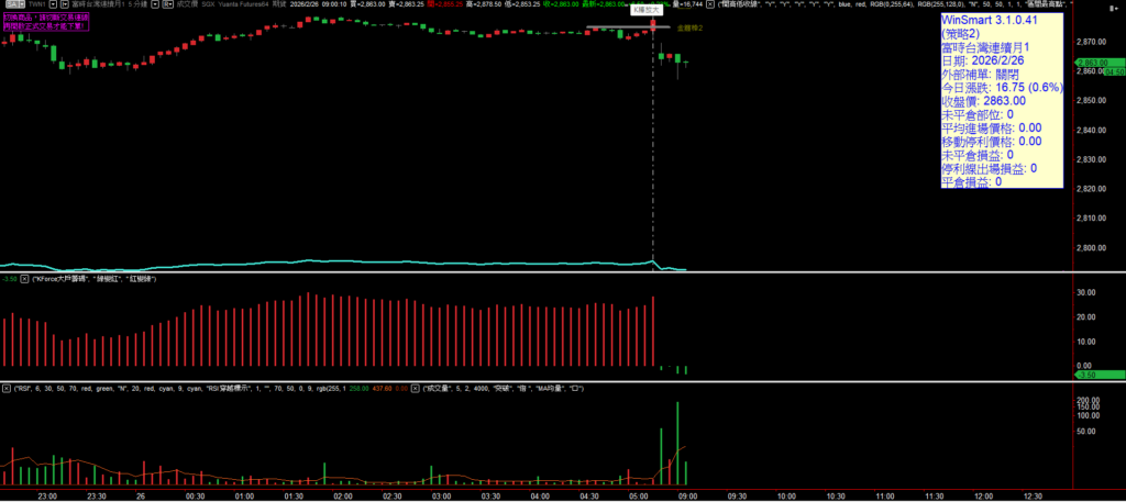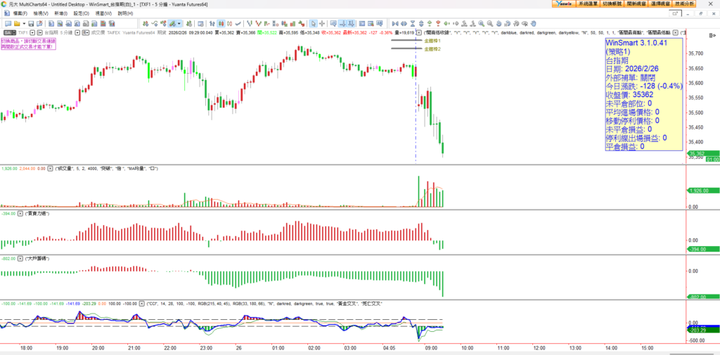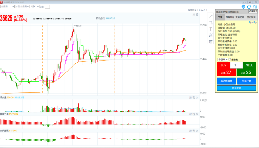 台指期五分K + 多空電話線 紫色往上走勢往上,昨天盤中大漲快九百點,就是一路子色電話線往上走的多頭走勢。