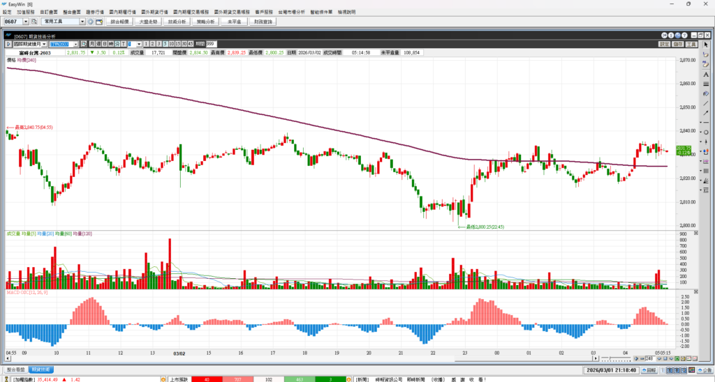 期貨走勢上週四、五的夜盤兩天下跌 合計1.6%左右。週末中東局勢又混亂,周一開盤下跌壓力是有的。