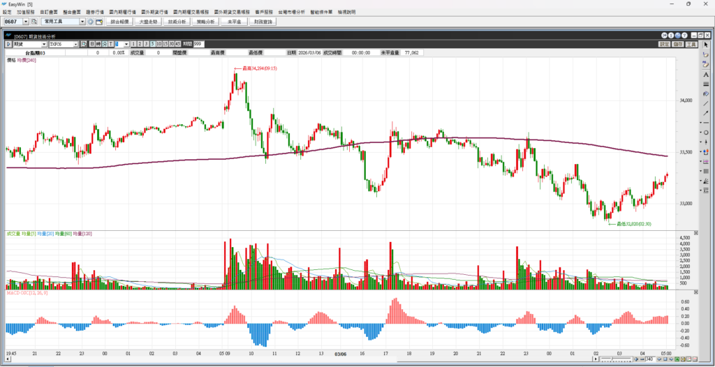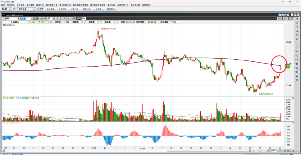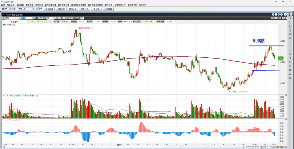 台指期昨日開高衝高後轉弱,最後一路震盪往下,高低差有1474點,這是很大的震盪幅度,請投資人降低槓桿操作。