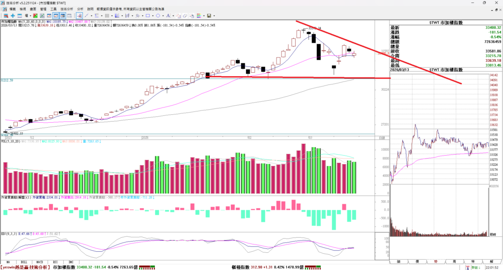 大家早安,受到中東戰火影響,上週台股走勢有如坐大怒神,先是單日閃崩兩千五百點,然後兩天時間大漲3066點,這算是史上最大的單日波動吧,上週五也是,原本台指期夜盤大跌一千點,但是開盤只開低七百點,然後一路開低走高往上拉將指數幾乎拉到平盤,單日拉抬一千點的幅度,最後下跌197點。最近指數看到漲跌個四五百點都算是小。跟一兩千點的幅度比較來,算是還好。在這麼大的波動之下,請務必設好停損和停利,不當死多頭 也不當死空頭。順著短線脈動調整方向。