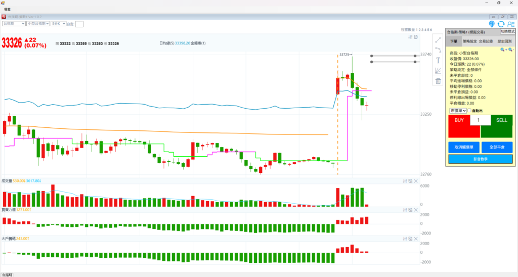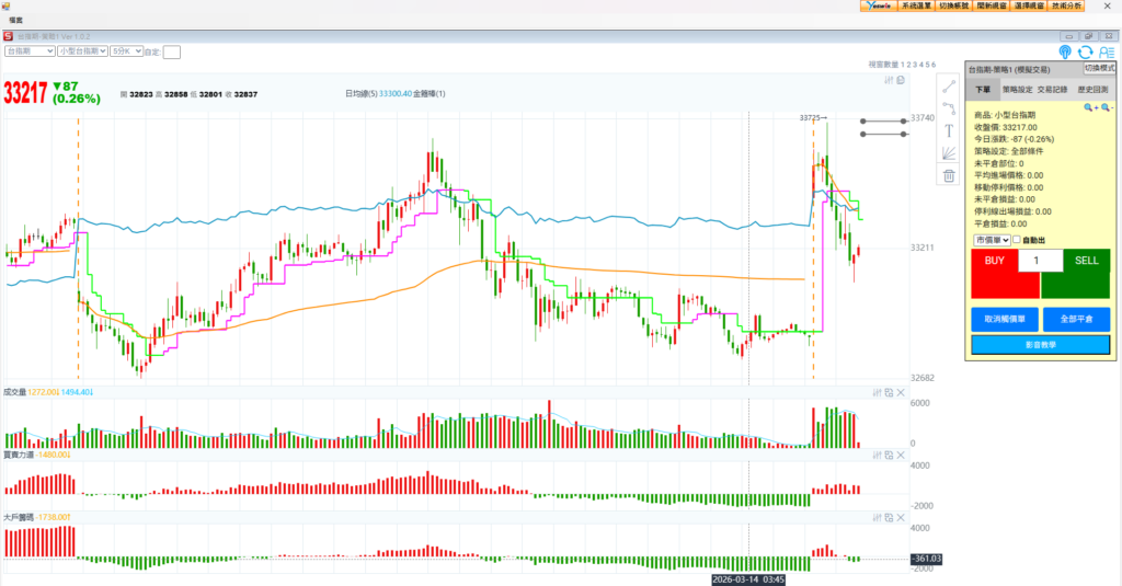 看台指期五分K + 多空電話線,我們看到底下是上周五白天 + 晚上的期貨走勢,看走勢也是極度不連續,先是前一天大跌千點,再來是隔天拉抬一千點,到了下午又走一座山的A轉走勢,指數沒有要去哪裡,原地踏步。每個轉折都有千點的震盪幅度,這種情況下選擇權權利金就會貴,一千點一天就會來。