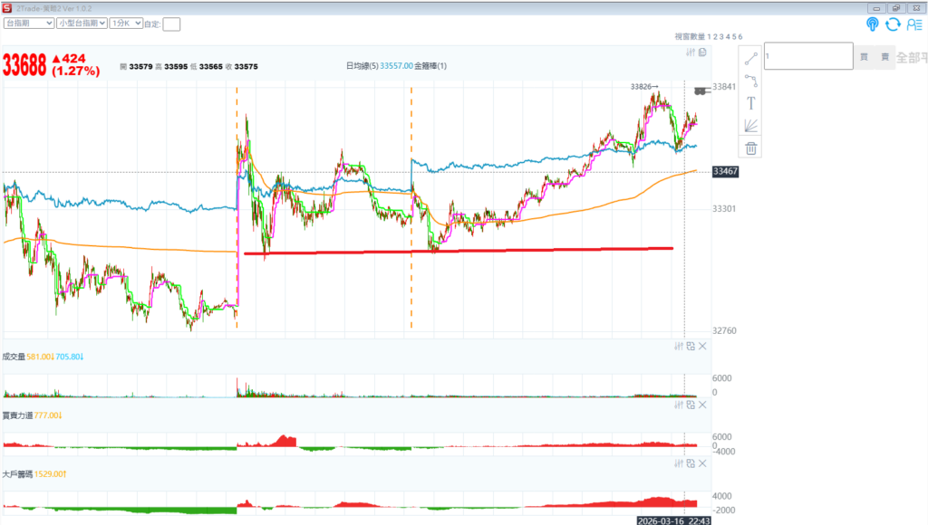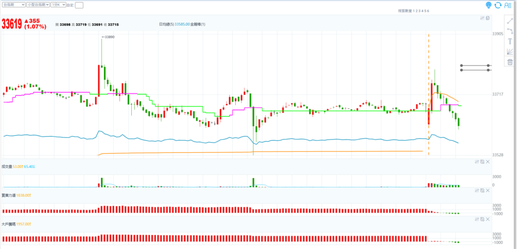 看台指期五分K,昨日白天開高走低震盪,下午過後回測昨日白天低點後一路往上拉,並且站上五日均,可以明顯看出昨天震盪一點是短線支撐 (下圖紅色線)