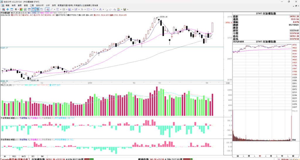 大家早安,川普在一早發表美國和伊朗暫時停火兩個禮拜的言論,然後亞股就爆了。韓股大漲6.58% 一度觸及融斷,日股大漲 5.39% 、台股大漲 4.61% 、澳洲股市大漲 2.74% ,全世界股票都因為川普的一個念投而大漲和大跌,他絕對是2025年 2026年的風雲人物,也是麻煩製造者。 台股報復性上漲讓空頭遇到巨大風險,開盤就跳空上漲 1400點 空頭無處可逃,特別是昨天晚上一度開高走低 高低差下跌六百多點,讓空頭以為行情會往下,結果今天開盤就直接跳空向上大漲。川普一句話牽動全世界股市。讓部分人大賺,讓部分人大賠。這裡要降低槓桿。