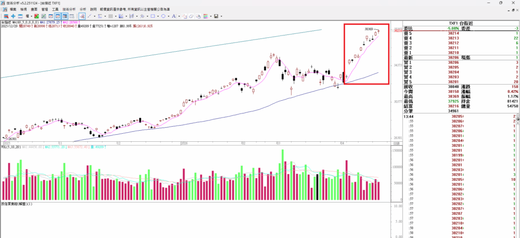 大家早安,昨天台股又上漲,上漲 273 點 漲到38096 ,行情看回不回持續創新高。指數往上大漲 ,超多人想放空台股,但是一直上漲 會一直停損。這一路上漲快六千點,回頭一看,指數就是沿著五日均往上爬,沿著五日均往上爬就是多方優勢。這樣想才對。