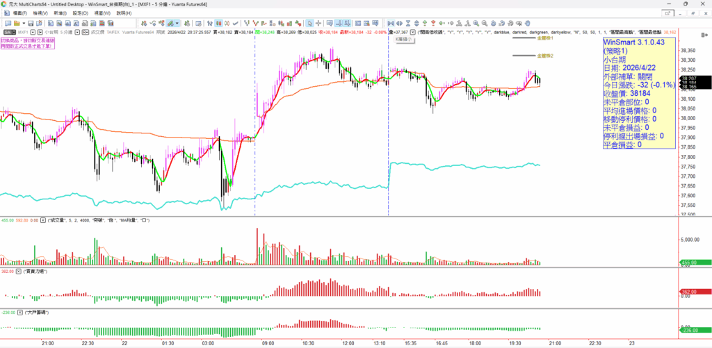 看台指期五分K + 均線 ,可以看得出昨天走勢早盤先跌一小段後一路往上拉,拉抬權值股 尤其是聯發科和鴻海大漲 帶動 期貨指數上漲